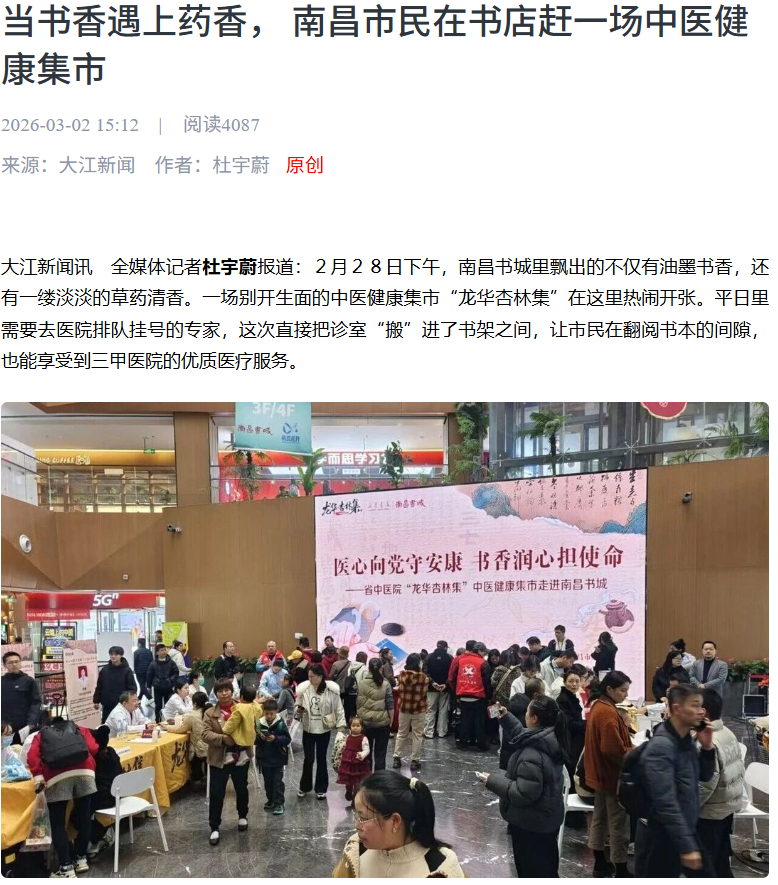 大江新闻讯 全媒体记者杜宇蔚报道:2月28日下午,南昌书城里飘出的不仅有油墨书香,还有一缕淡淡的草药清香。一场别开生面的中医健康集市“龙华杏林集”在这里热闹开张。平日里需要去医院排队挂号的专家,这次直接把诊室“搬”进了书架之间,让市民在翻阅书本的间隙,也能享受到三甲医院的优质医疗服务。