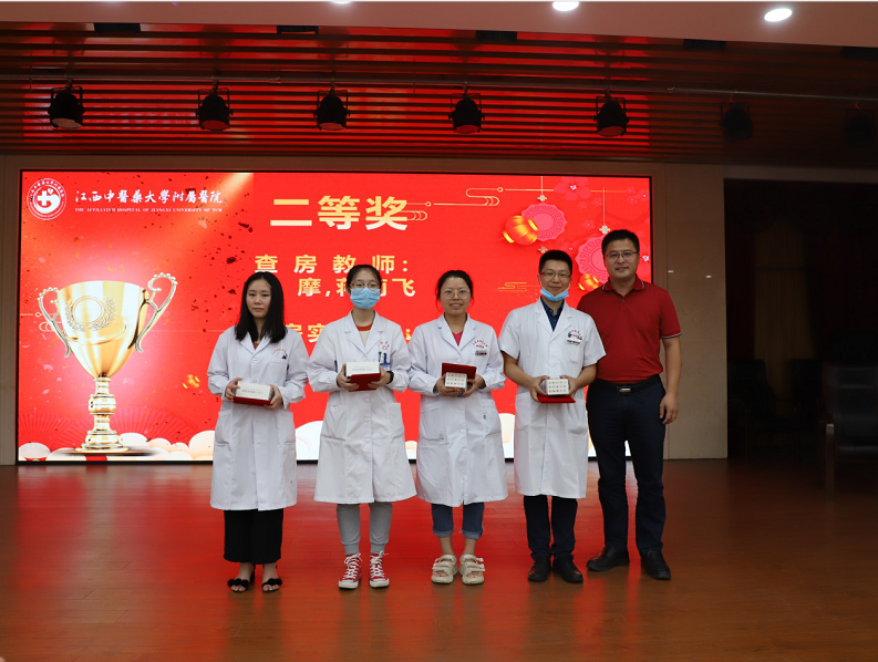 本届比赛形式与以往不同,往届教学查房在科室示教室和床边进行,受众面较小,且赛程较长。本届比赛创新方式将其搬至舞台,充分发挥信息技术将比赛过程投影至大屏幕,以供评委全景式打分、全院医生和学生观摩。比赛由示教室查房和病房查房两个阶段,时长为30分钟,由七位评审专家根据评分细则,分别评出查房教师和查房实习生一等奖各1名,二等奖各2名,三等奖各3名。