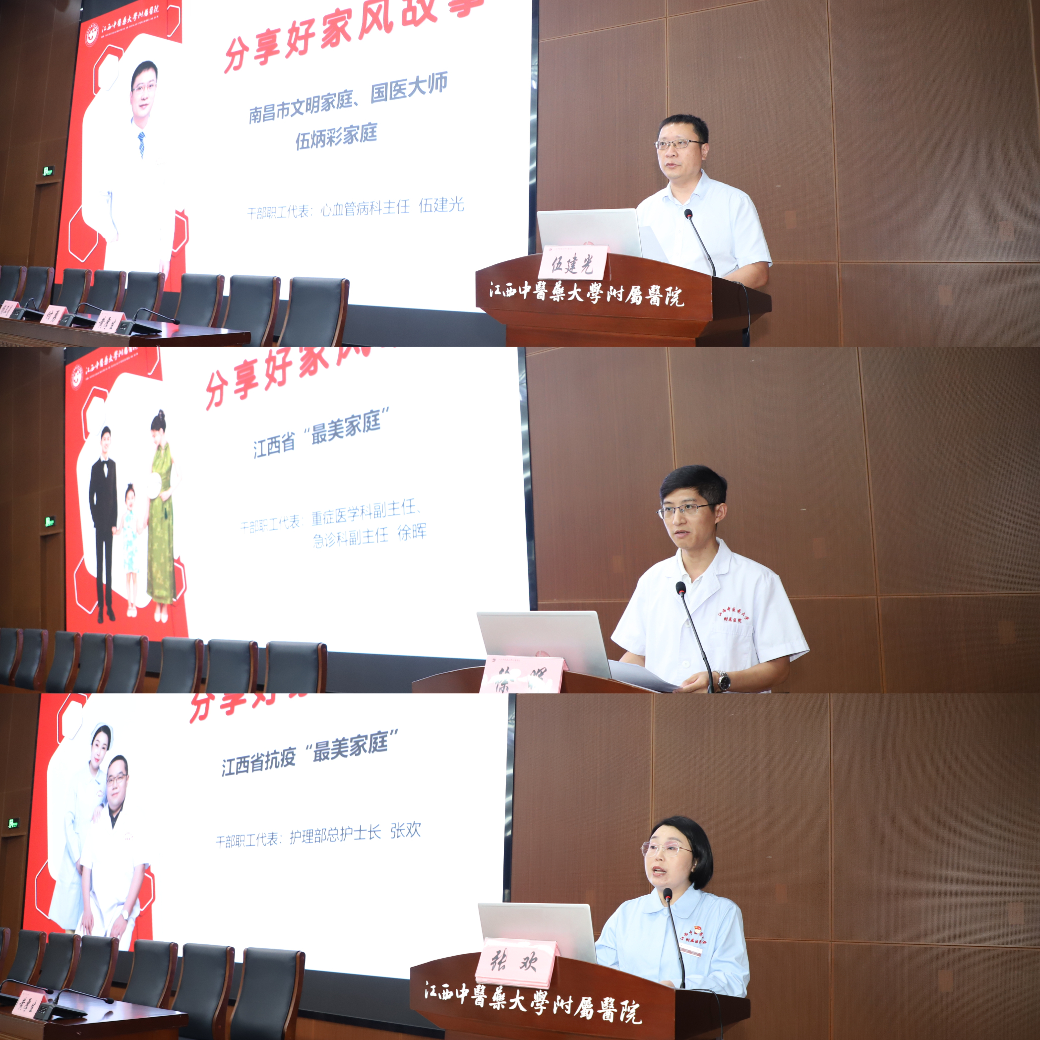 会上,南昌市文明家庭、国医大师伍炳彩家属伍建光,江西省“最美家庭”获得者徐晖,江西省抗疫“最美家庭”获得者张欢作为干部职工代表现场分享了他们的家风故事。