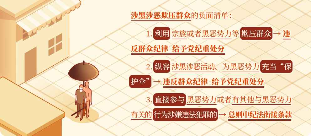 《中国共产党纪律处分条例》将利用宗族或者黑恶势力等欺压群众,或者纵容涉黑涉恶活动、为黑恶势力充当“保护伞”行为,规定为违反群众纪律的行为,给予撤销党内职务或者留党察看处分;情节严重的,给予开除党籍处分。