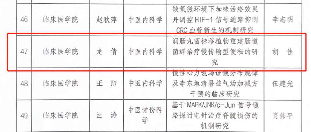 在最新公布的2023年度江西中医药大学研究生创新专项资金拟立项名单中,工作室2022年研究生龙倩获得立项资助,她本次申报的课题为《润肠丸菌株移植物重建肠道菌群治疗慢传输型便秘的研究》。