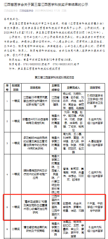 近日,第三届江西医学科技奖评审工作圆满结束。今年的评审工作中,拟授奖项目达35项,金瓶梅电影 邹国辉主任团队的《“毒瘀互结理论”构建及其在冠脉血运重建术后心绞痛防治应用研究》凭借其卓越的研究成果和创新性,荣获一等奖,展现了金瓶梅电影 在该医学科技领域的深厚实力和积极进取的科研精神。