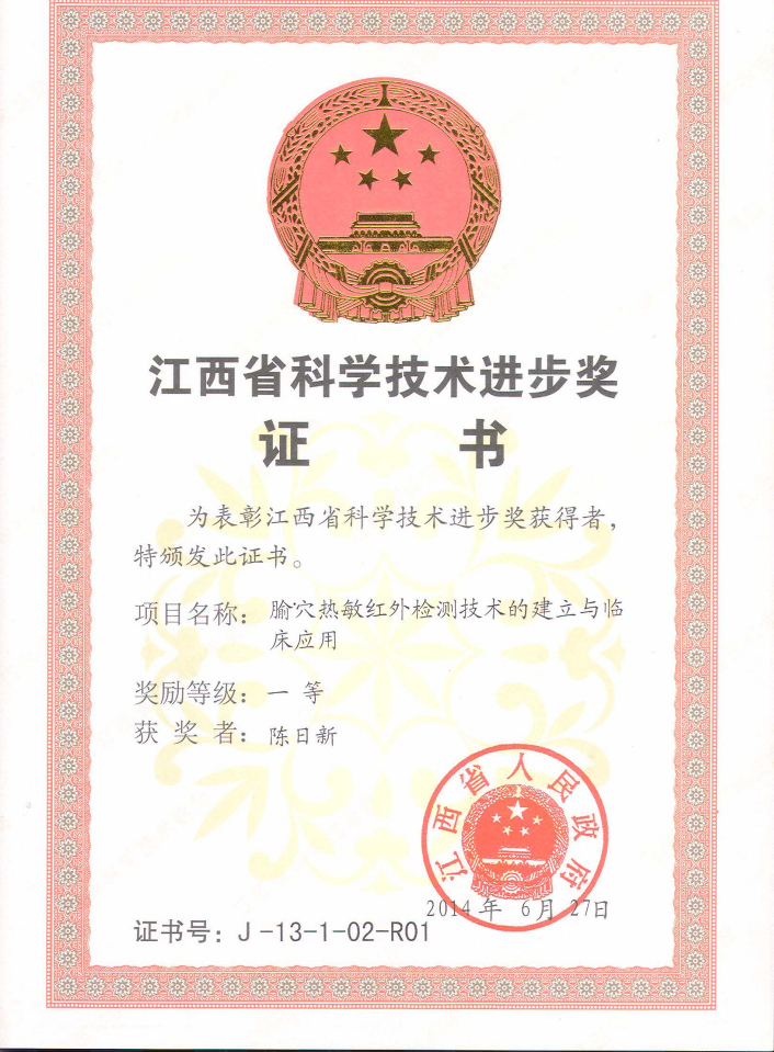 陈日新:腧穴热敏红外检测技术的建立与临床应用获得江西省科技技术进步一等奖