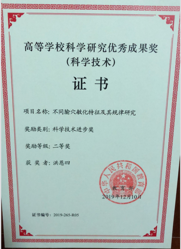 洪恩四:不同腧穴敏化特征及其规律研究中获得高等学校科学技术进步奖二等奖