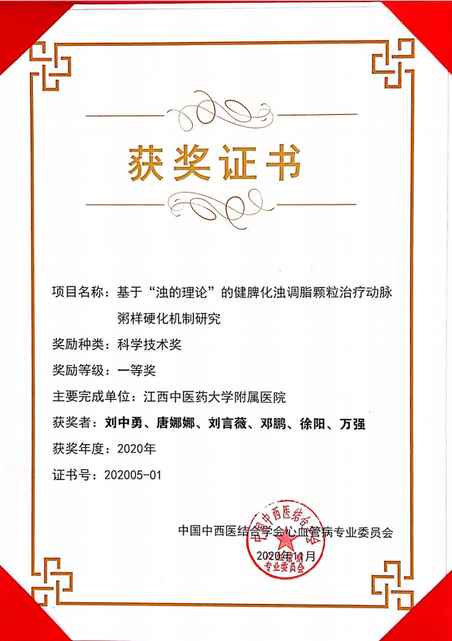 刘中勇团队:基于“浊的理论”的健脾化浊调脂颗粒治疗动脉粥样硬化机制研究中荣获科技技术一等奖 发布时间:2023-07-20点击次数:15366次 刘中勇团队:基于“浊的理论”的健脾化浊调脂颗粒治疗动脉粥样硬化机制研究中荣获科技技术一等奖