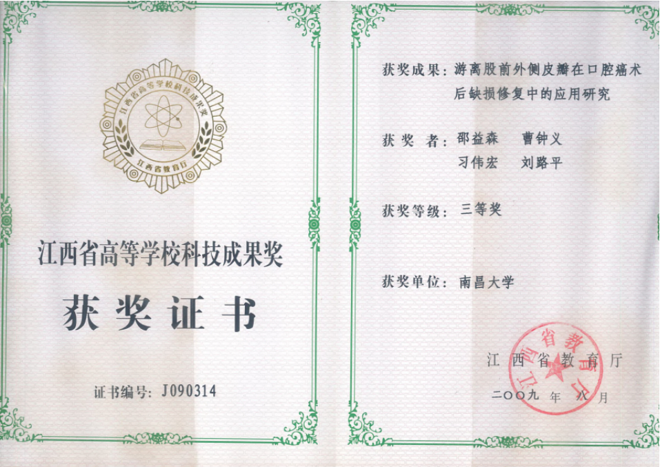 邵益森:游离股前外侧在口腔癌术后缺损修复中的应用研究获得科技成果三等奖