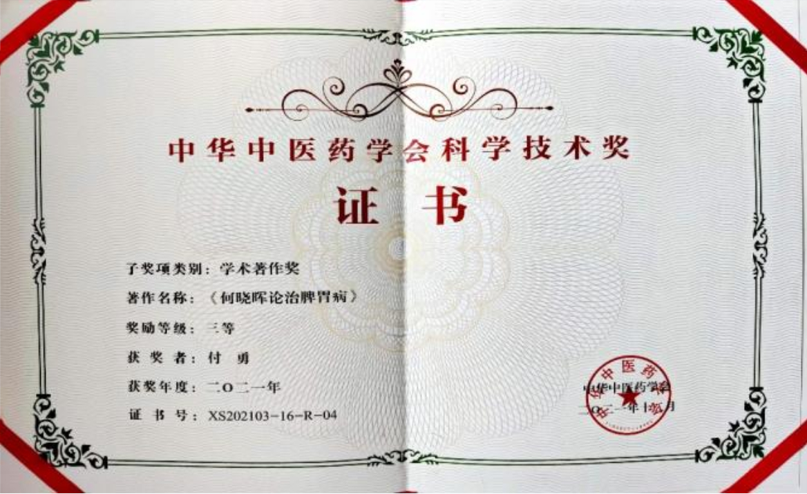 2021年付勇著作【何晓晖论治脾胃病】获得中华中医药学会科学技术三等奖