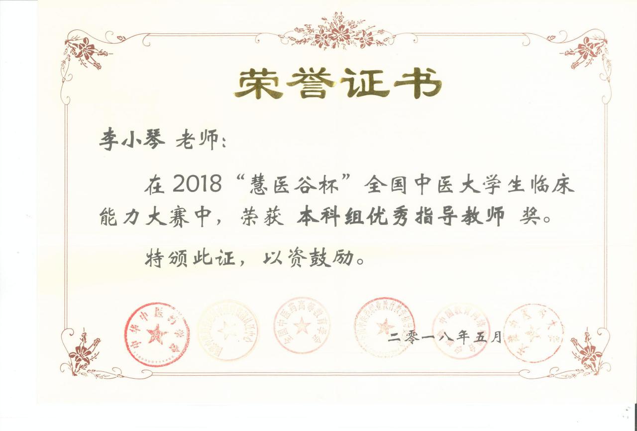 李小琴 “慧医谷杯”全国中医大学生临床能力大赛优秀指导老师