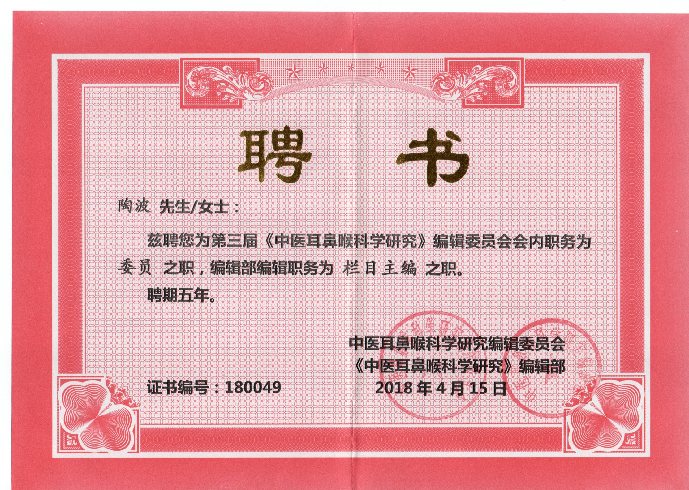 陶波主任当选为《中医耳鼻喉科学研究》编委兼栏目主编