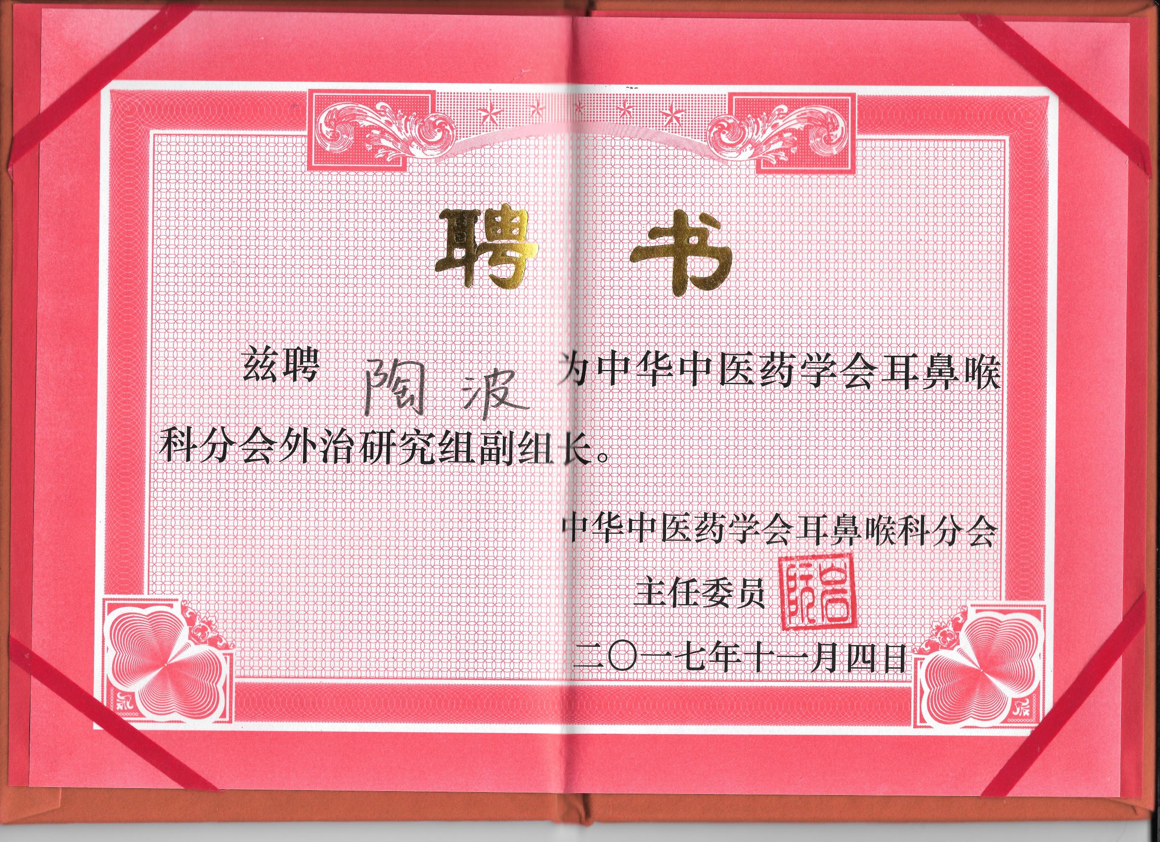 陶波主任当选中华中医药学会耳鼻喉科分会第六届委员会常务委员