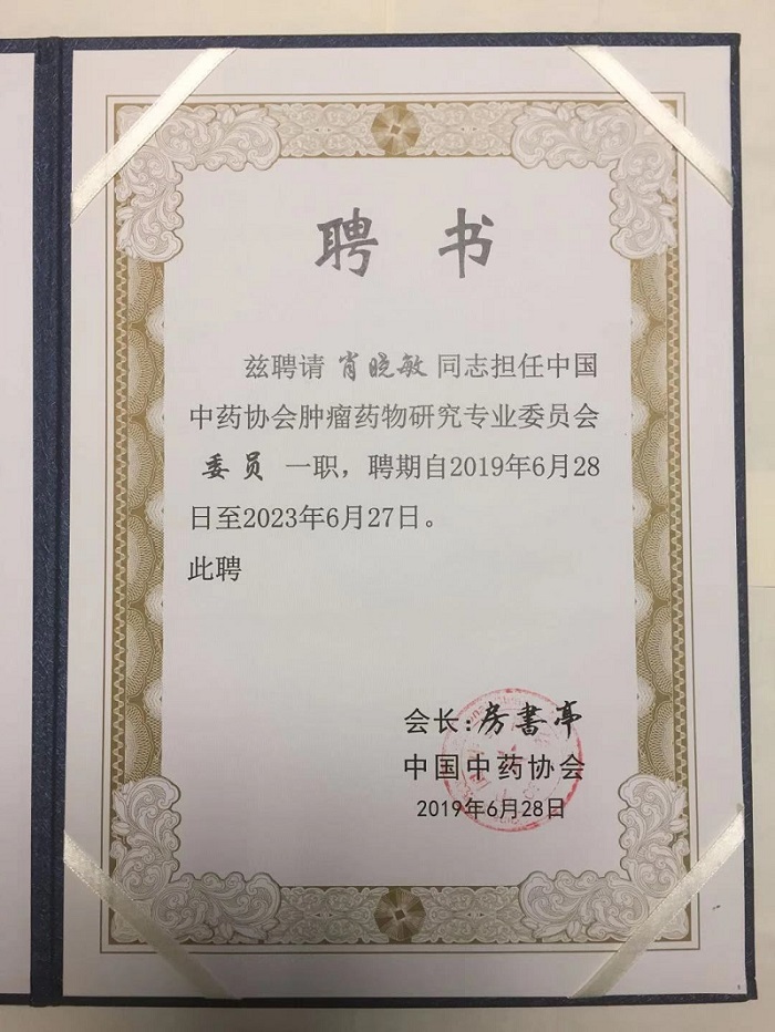肖晓敏担任中国中药协会肿瘤药物研究专业委员会委员