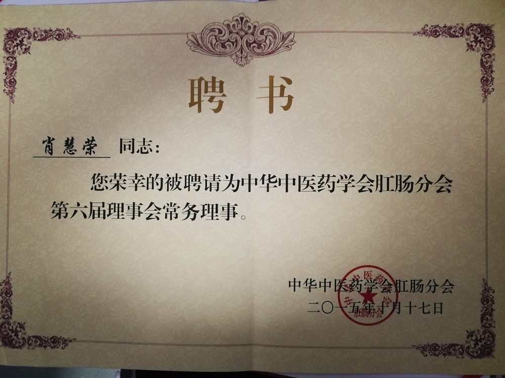 肛肠科肖慧荣当选中华中医药学分肛肠分会常务理事