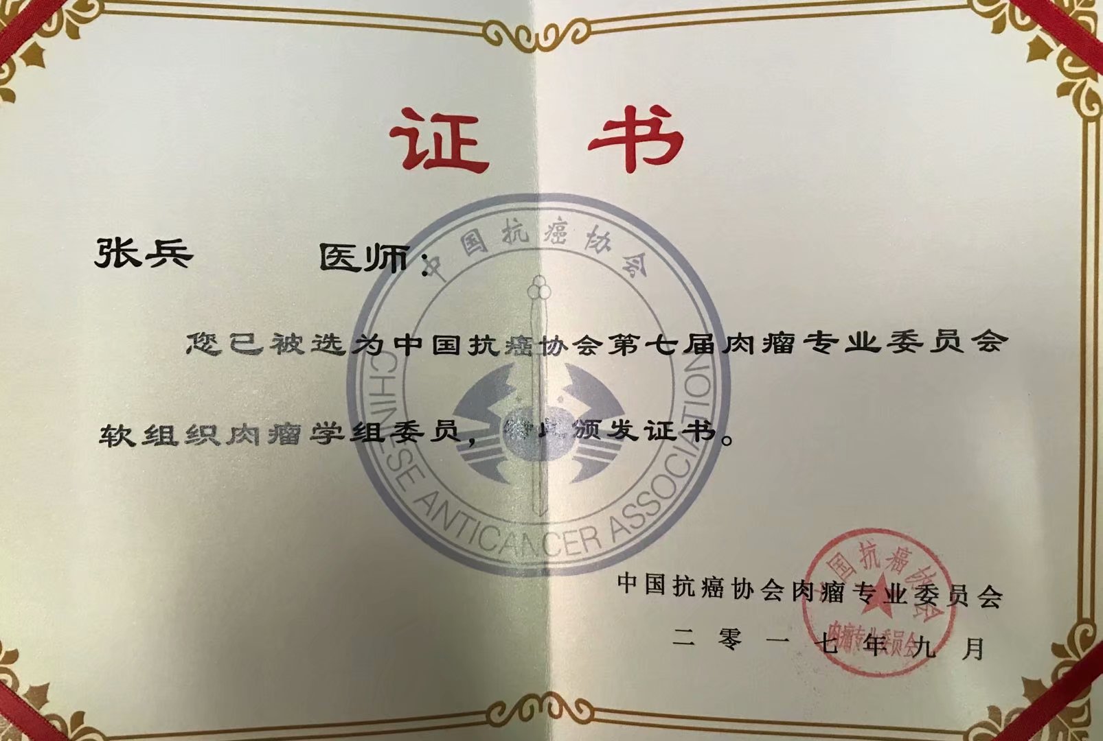 张兵当选中国抗癌协会第七届肉瘤专业委员会软组织肉瘤学组委员