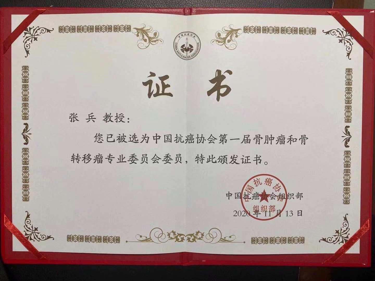 张兵当选中国抗癌协会第一届骨肿瘤和骨转移瘤专业委员会委员
