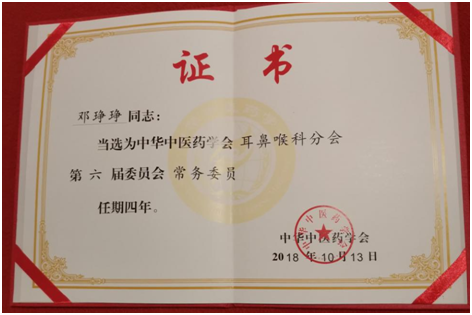 邓琤琤当选中华中医药学会耳鼻喉科分会第六届委员会常务委员