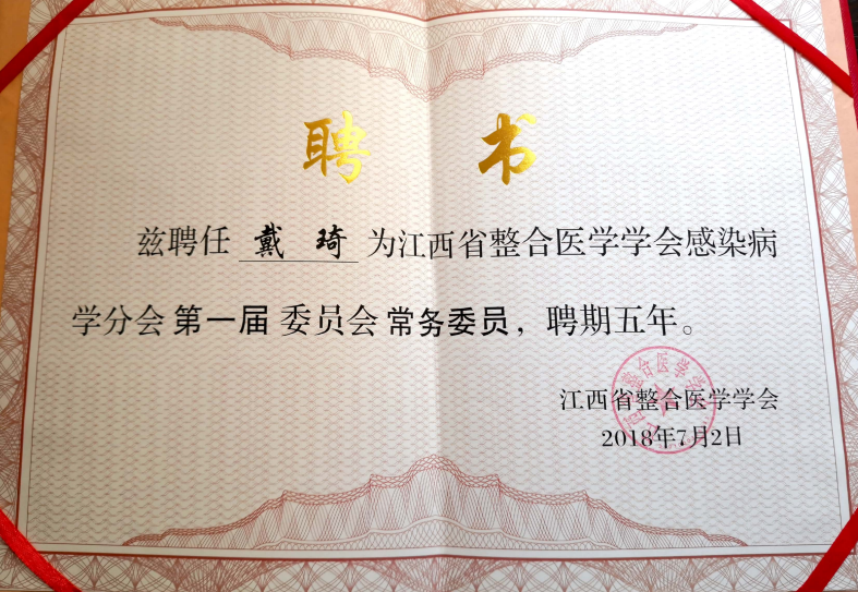 戴琦当选江西省整合医学学会感染病学分会第一届委员会常务委员