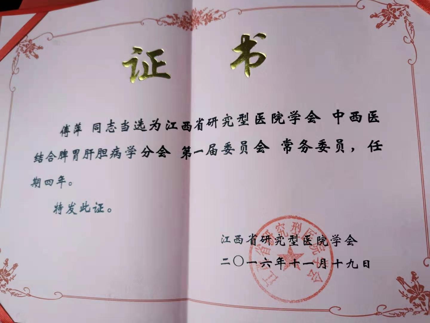 傅萍当选江西省中医药学会中西医结合脾胃肝胆病学分会第一届常务委员