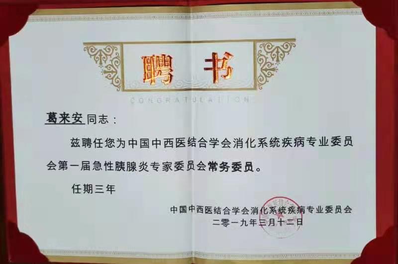 葛来安中国中西医结合学会消化系统疾病专业委员会第一届记性胰腺炎专家委员会常务委员