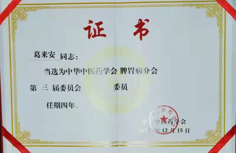葛来安当选中华中医药学会脾胃病分会第三届委员会委员