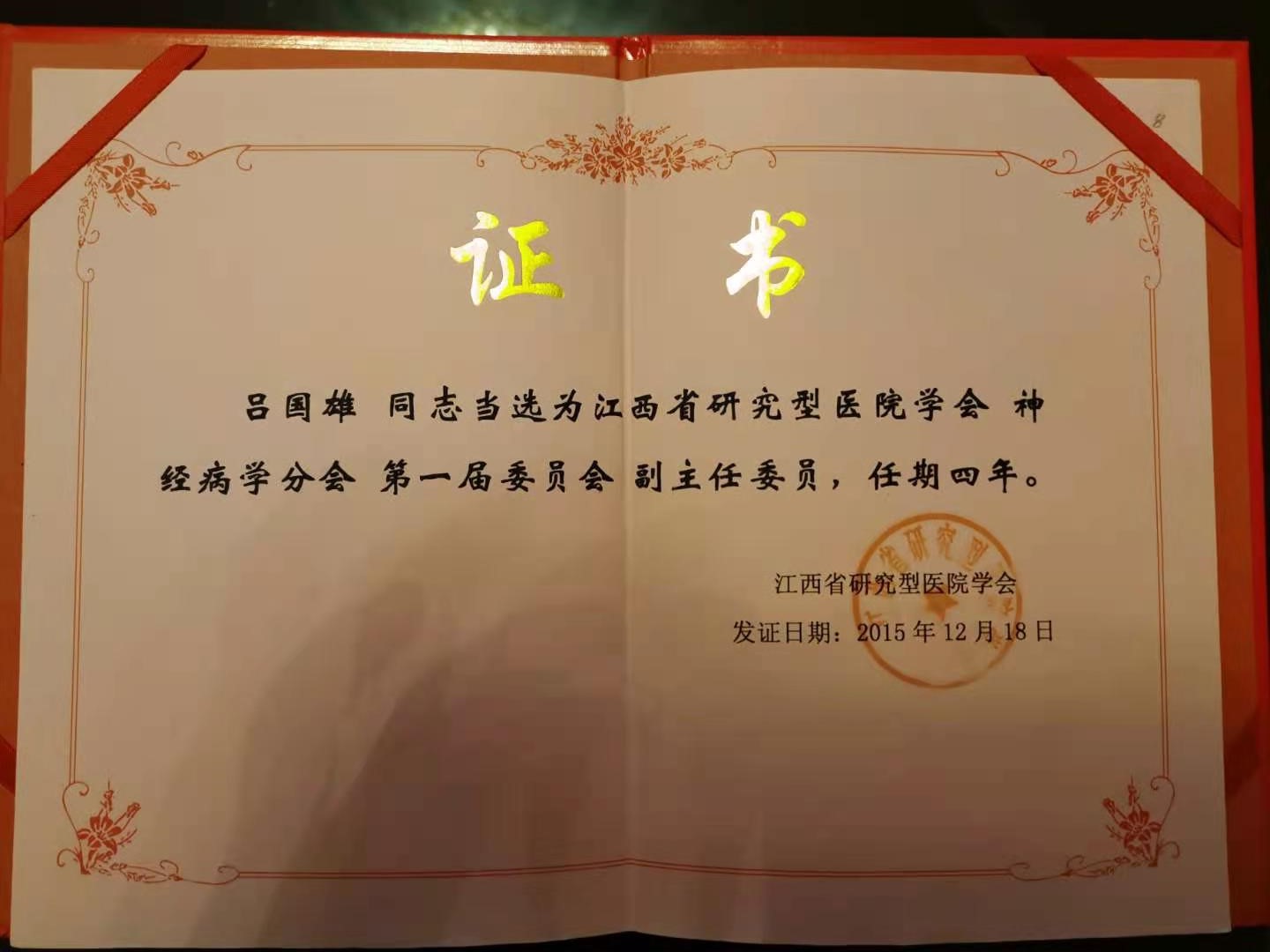 吕国雄当选江西省研究型金瓶梅电影 学会神经病学分会第一届委员会副主任委员