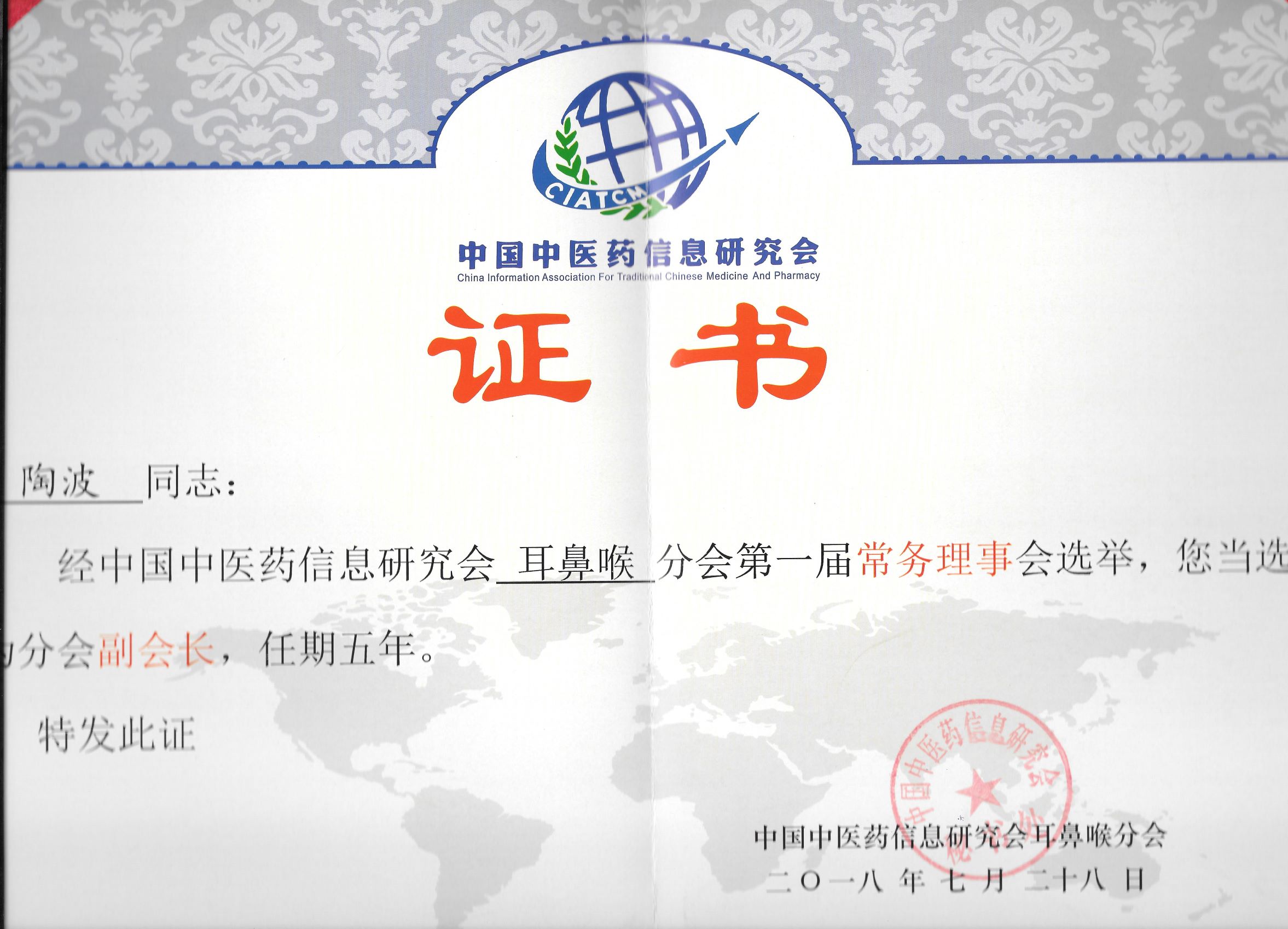 陶波主任当选中国中医药信息研究会耳鼻喉分会第一届理事会副会长