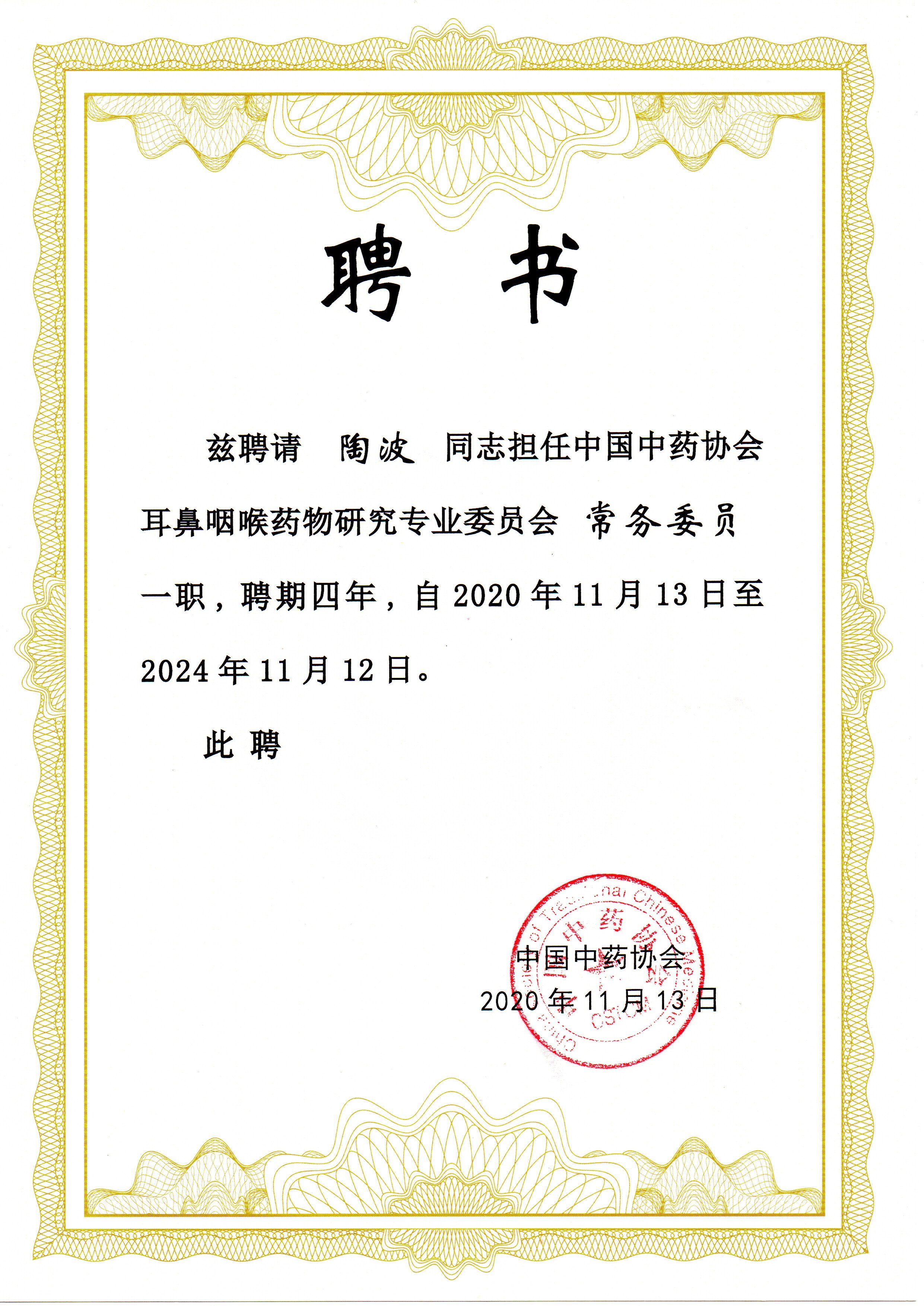 陶波主任当选为中国中药协会耳鼻咽喉药物研究专业委员会常委