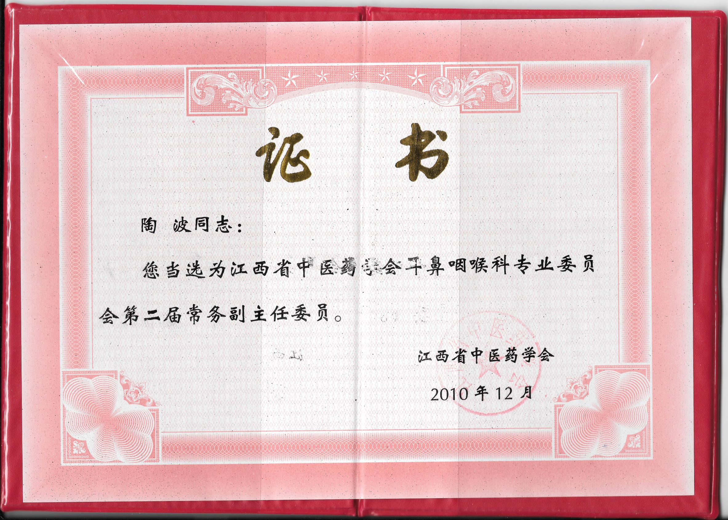 陶波主任当选为江西省中医药学会耳鼻咽喉科专业委员会第二届常务副主任委员