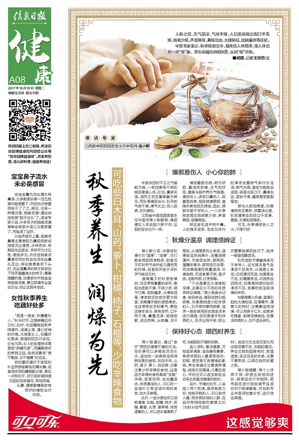 中医专家表示,秋季燥邪当令,易耗伤人体阴津,使人体出现一派“燥”象。养生保健应辨明体质,从润“燥”开始。