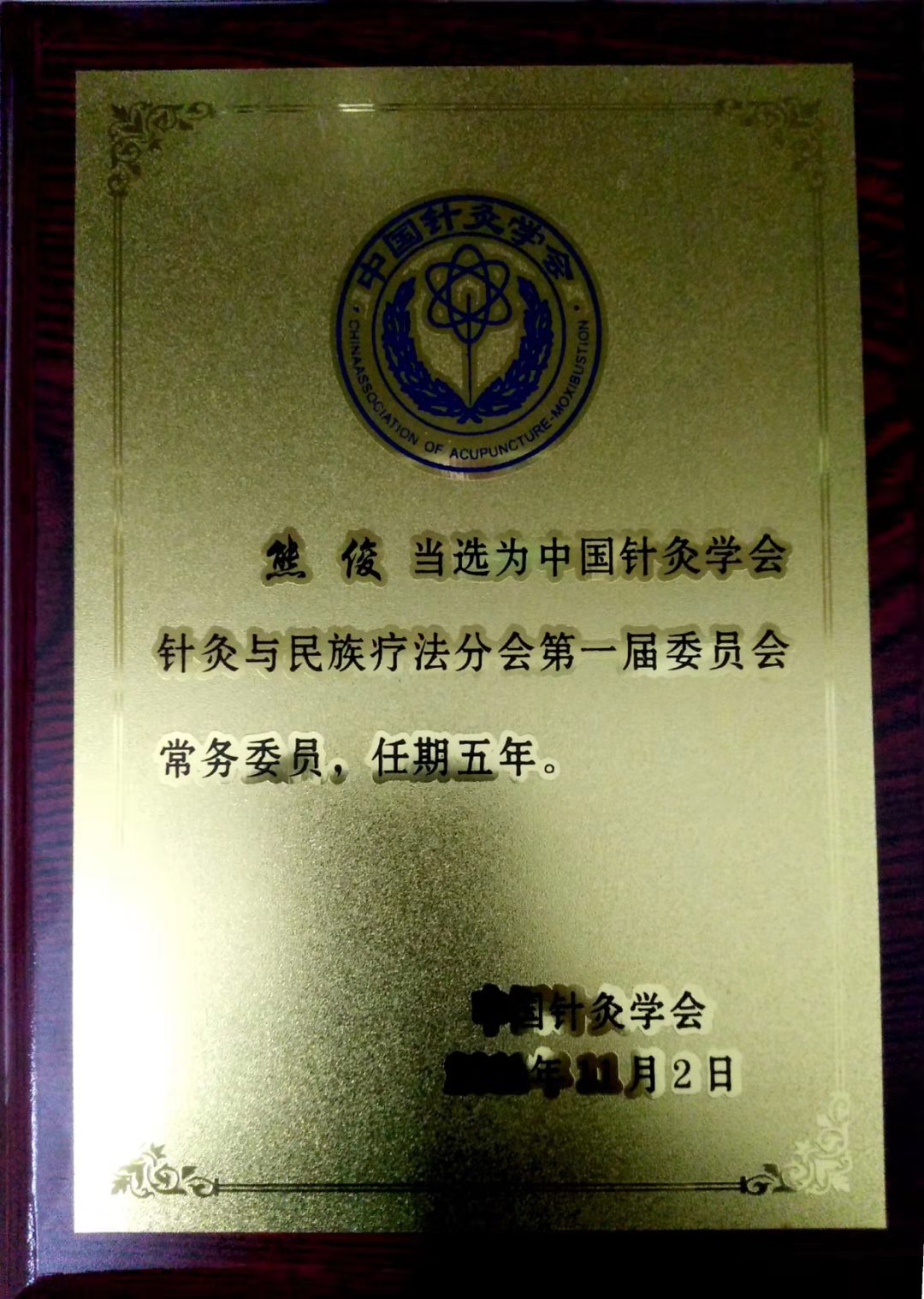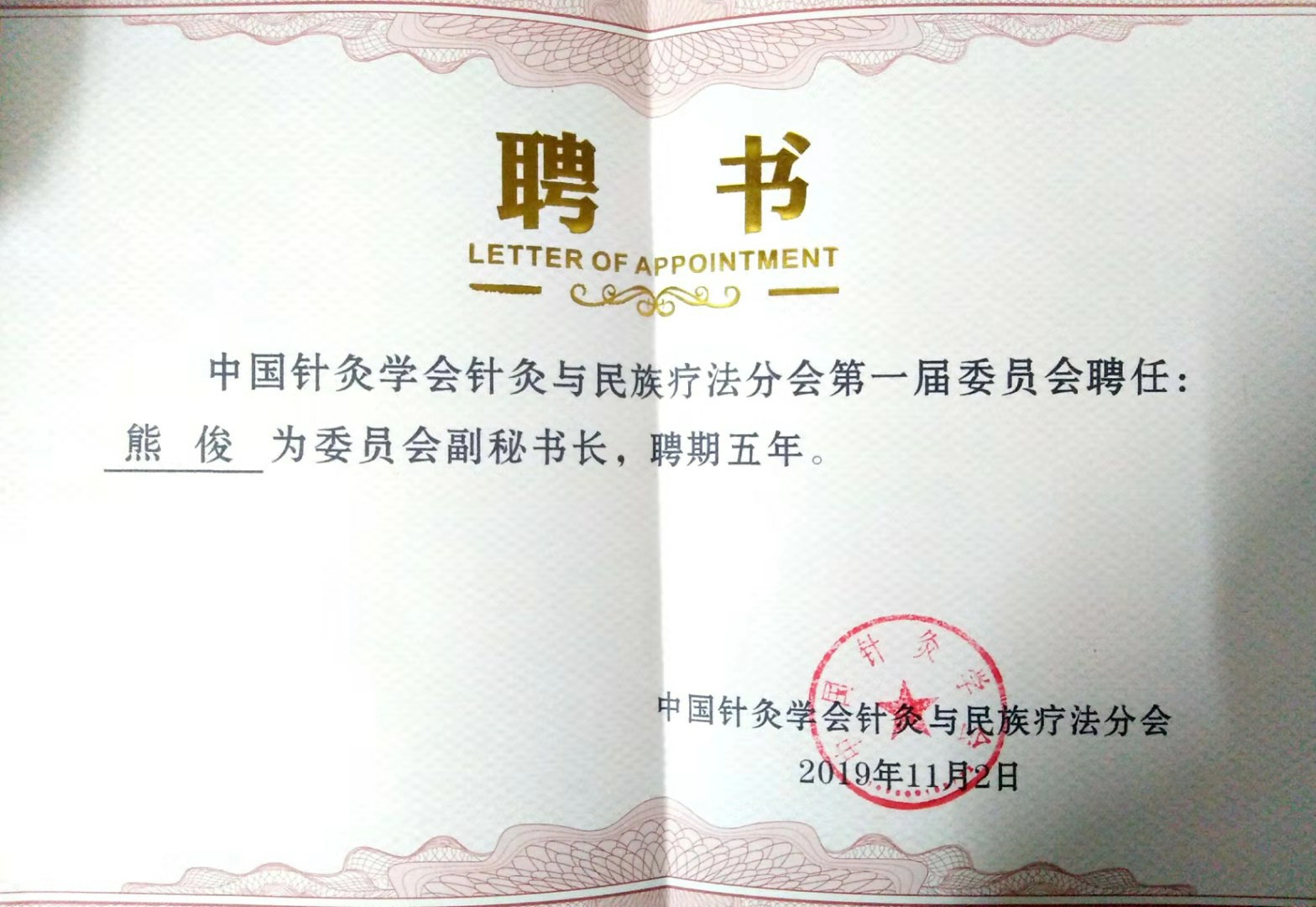 熊俊主任当选中国针灸学会针灸与民族疗法分会常务委员、副秘书长。