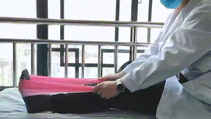 取坐位,将腿伸直,用一条拉力带(常用的瑜伽拉力带即可)绕患侧足底,双手握住拉力带进行脚踝的牵拉训练。