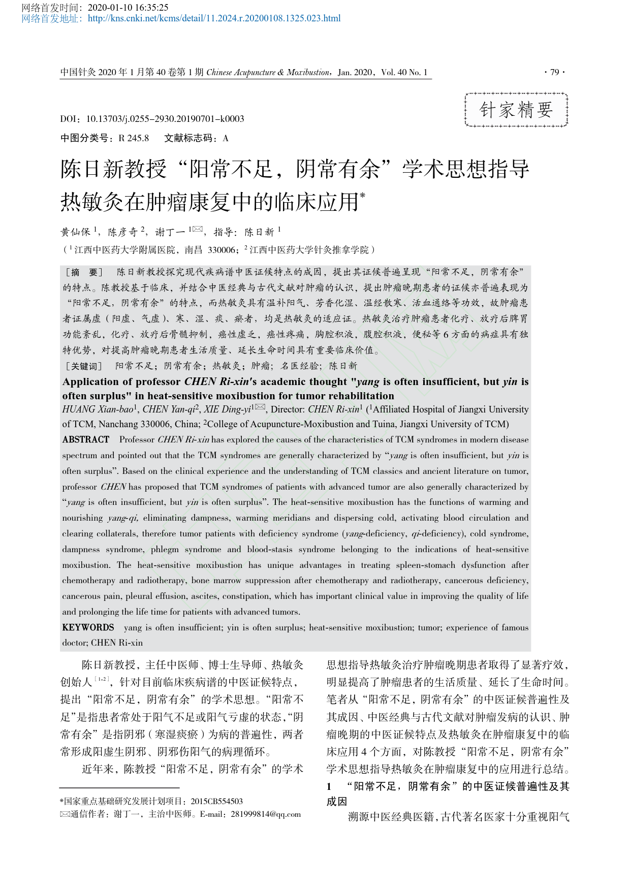 【学术】陈日新教授“阳常不足,阴常有余”学术思想指导 热敏灸在肿瘤康复中的临床应用