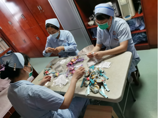 预备党员周群同志及万芳丹同志为患者准备香囊