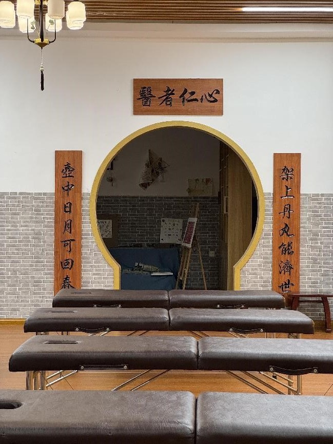 义诊活动在南师附小内的中医馆内进行,馆内各种诊疗设施齐全,诊疗床干净整洁,学生们自制的中医药知识海报琳琅满目,中医氛围浓厚,展现了学校师生对中医药文化的浓厚兴趣。