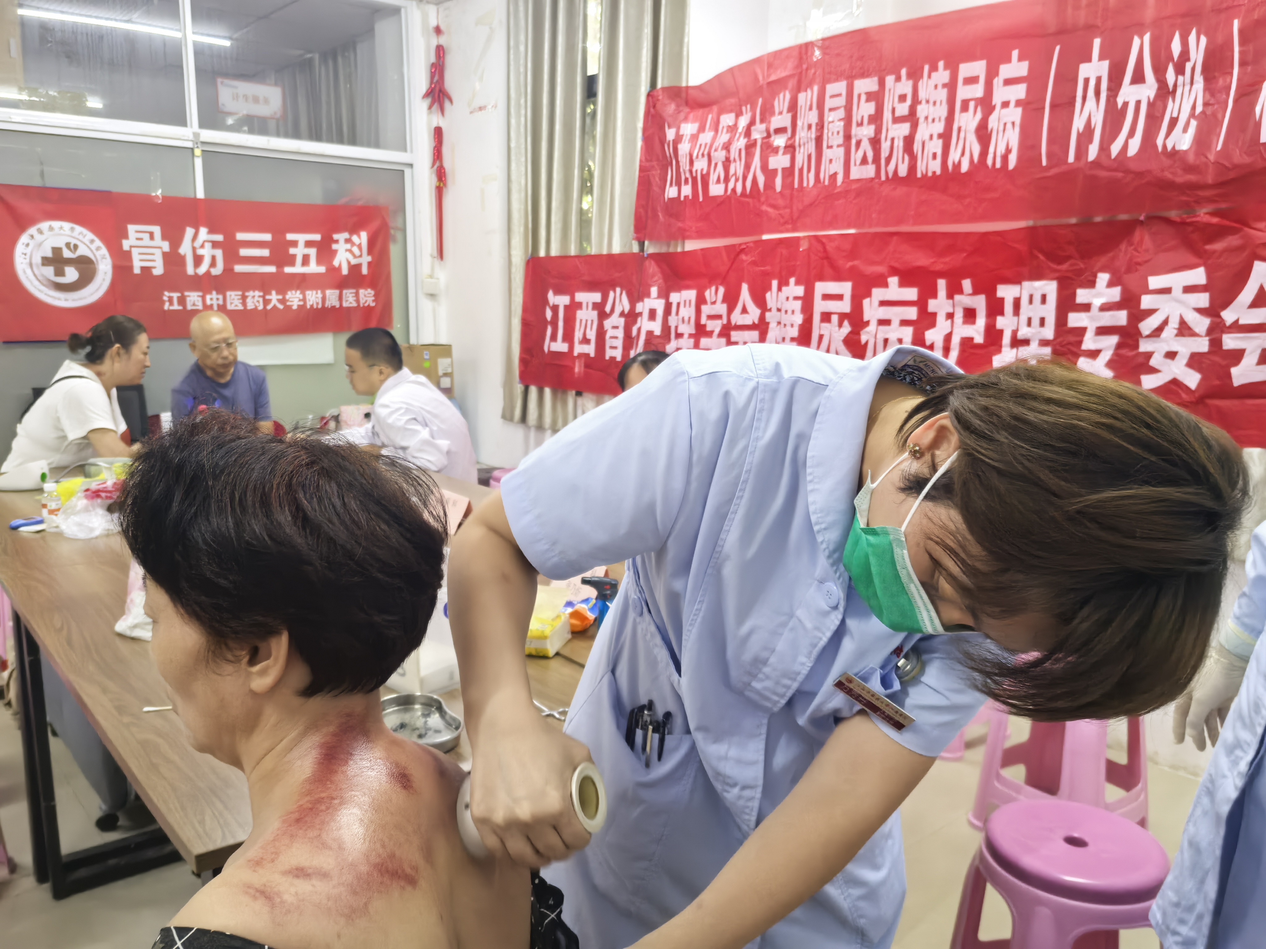 活动现场,糖尿病科青年文明号预创建集体成员和各科医护人员热情周到地为居民提供测血压、测血糖等基础检查,并细致解答关于慢性病管理、呼吸道保健、骨骼健康等问题。护理团队特别带来中医特色温灸罐服务,通过温通经络、祛寒除湿,让居民体验传统中医技术的独特魅力,深受中老年朋友喜爱。纷纷称赞:“你们来得太及时了,这才是实实在在的关怀!”