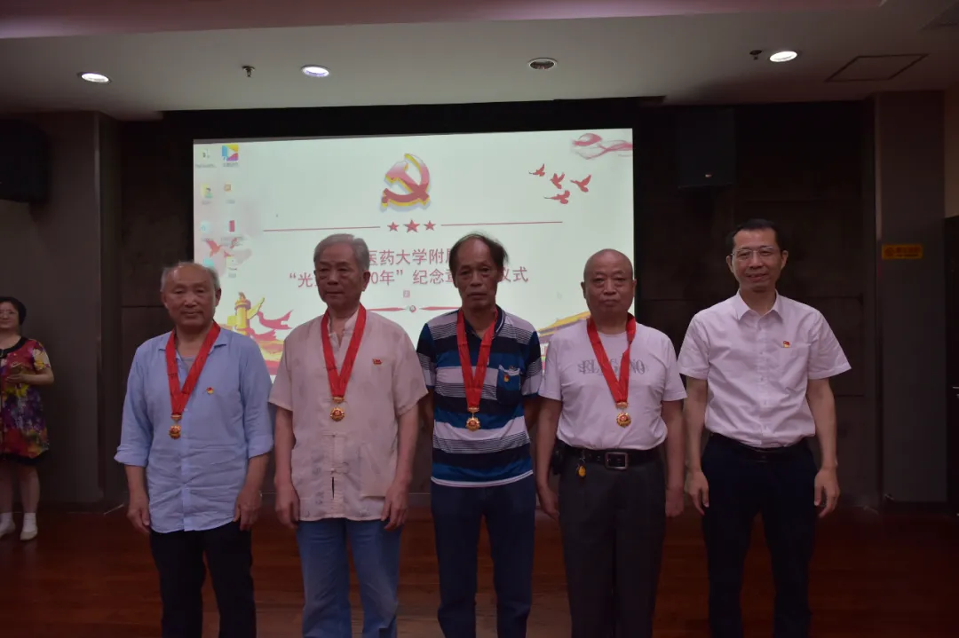 江西中医药大学党委委员、副校长、附属金瓶梅电影 党委书记章德林一一为50年以上党龄的金瓶梅电影 老党员颁发“光荣在党50年”纪念章。