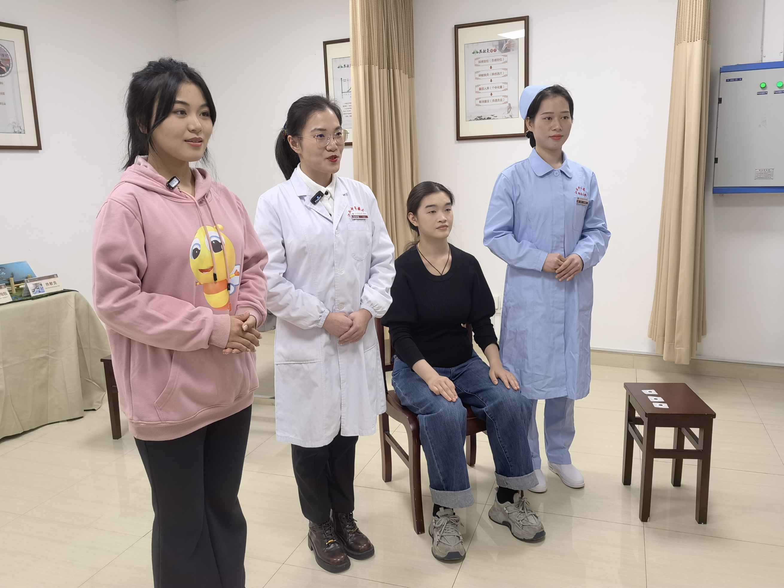 中医治疗室内妇科胡锦誉博士就穴位贴敷的临床功效、如何使用、注意事项等问题向大家作了详细的解说,胡叶护士向我们展示了暖宫贴、痛经贴的详细操作步骤。