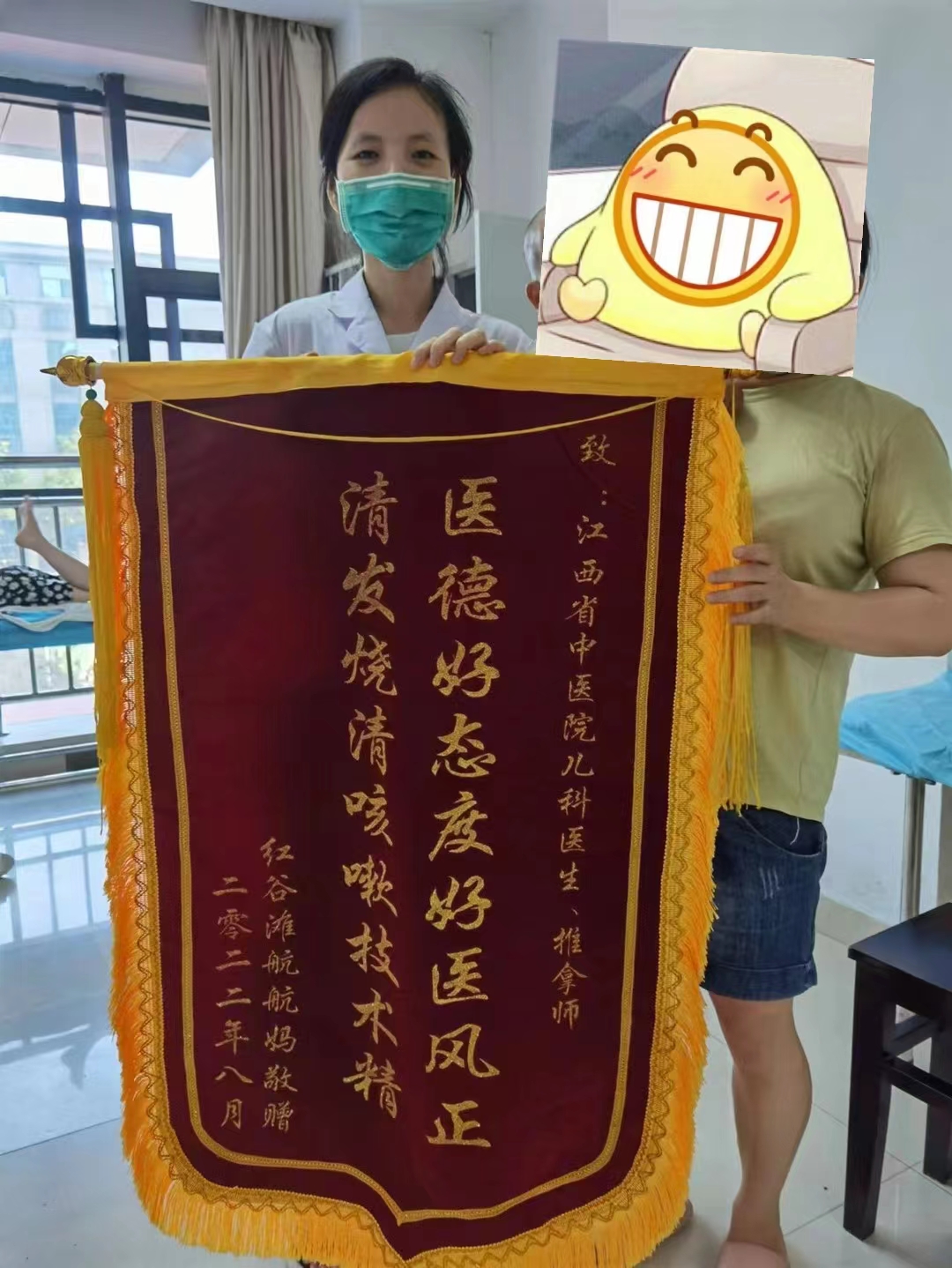 一面锦旗,一种肯定,一份信任,一个鼓励,一段故事。近日,航航妈妈将一面印着“医德好态度好医风正,清发烧清咳嗽技术精”的锦旗送到儿科医生、推拿师的手中,以感谢刘英主任及陈小云医师精湛的医术及热情的服务。