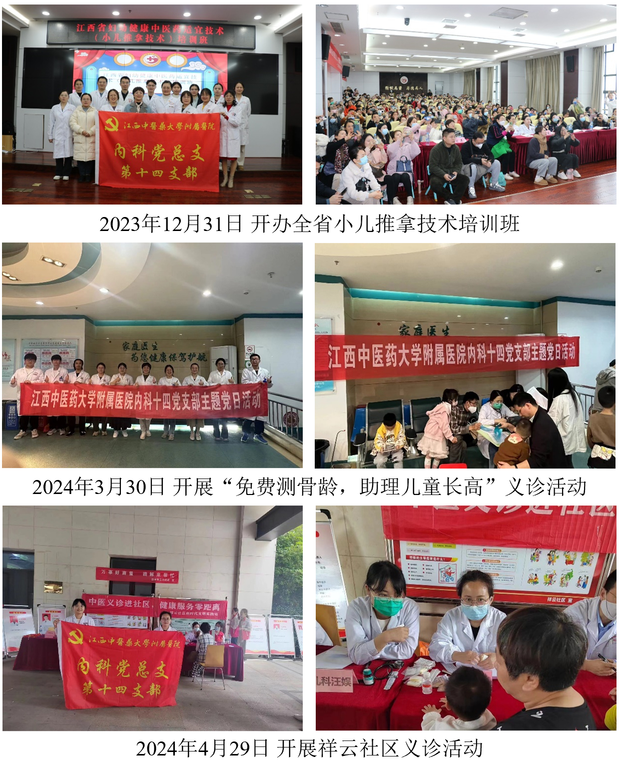 内科第十四党支部在主抓支部党建思想的基础上,更是把党建融入到儿科医疗业务当中,除日常东湖院区、西湖院区、红谷滩国医堂门诊,以及住院部的日常医疗工作外,还组织开展江西省小儿推拿适宜技术培训班,以及参与区、县、村等各级义诊活动,从业务出发,将先进医疗技术辐射全省,深刻体现党建赋能儿科高质量发展活力与凝聚力,打造高素质儿科人才队伍,助推金瓶梅电影 高质量发展。