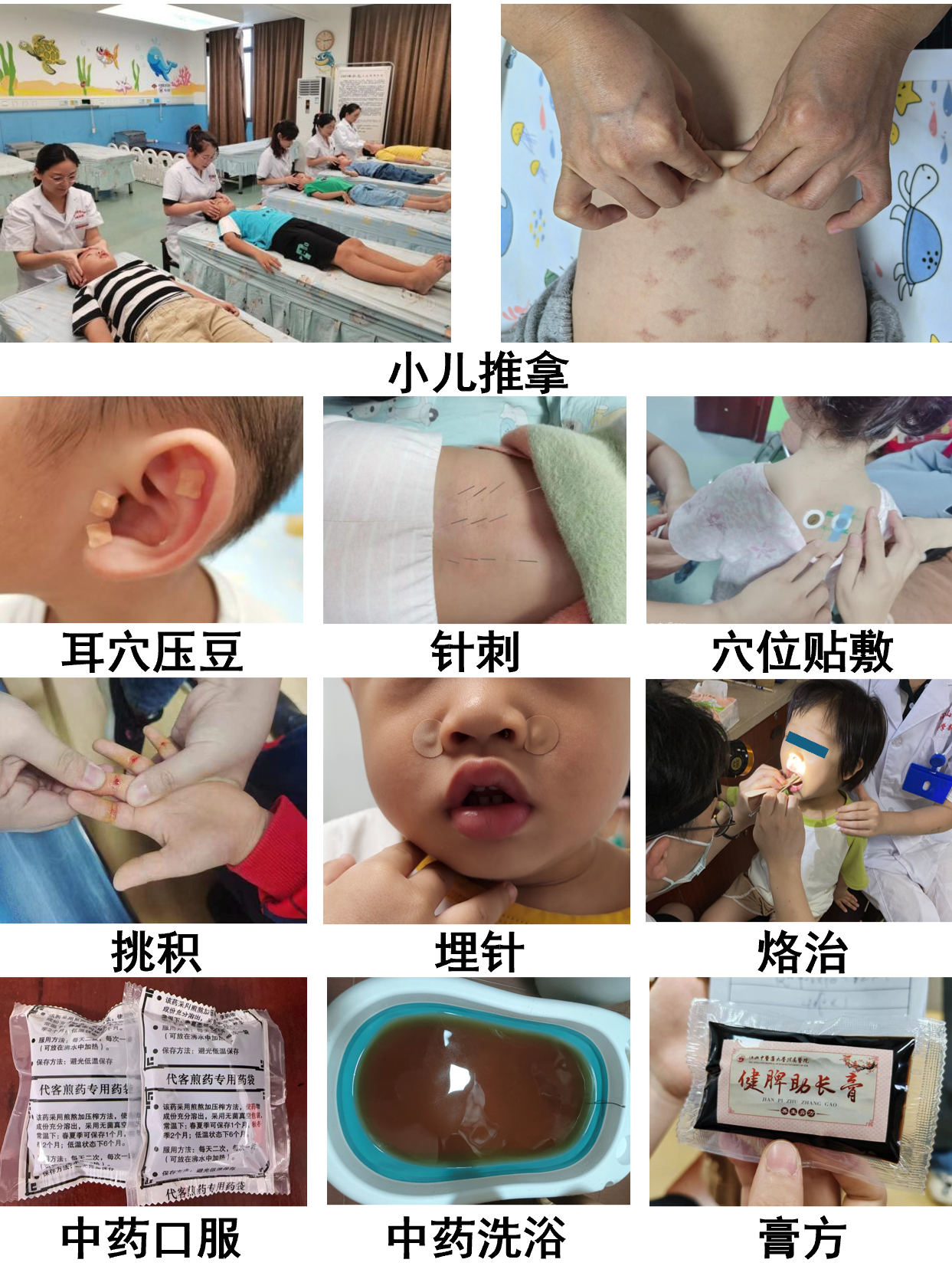 目前,儿科开展的小儿推拿、穴位贴敷、耳穴压豆、针灸、埋针、刺四缝(即挑积)、中药口服、中药洗浴、膏方等中医特色治疗方法,减少了患儿打针输液的痛苦,深受患儿及家长的喜爱。自2017年9月开展小儿推拿以来,每年运用小儿推拿治疗儿童超过20000人次,病患的小儿推拿接受率及使用率不断提高,知名度不断提升。小儿推拿技术已成为科室的“明星疗法”。