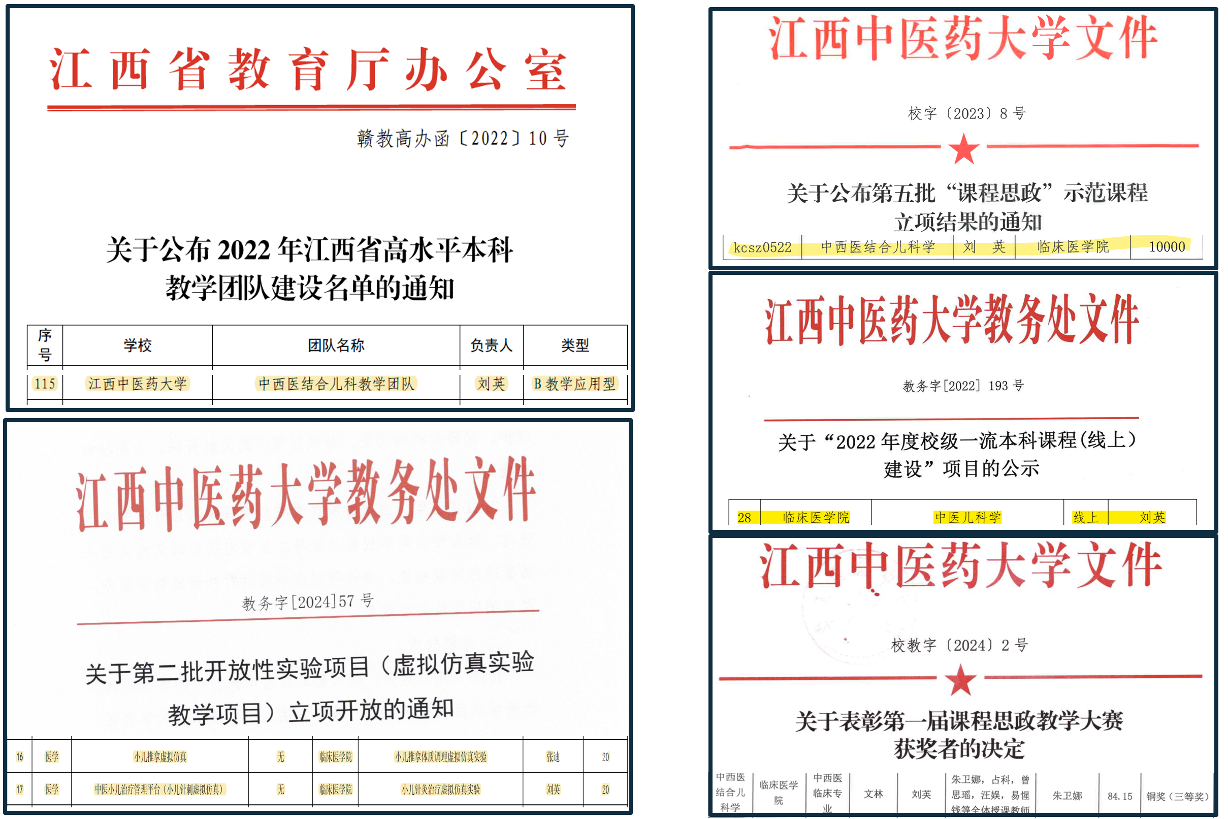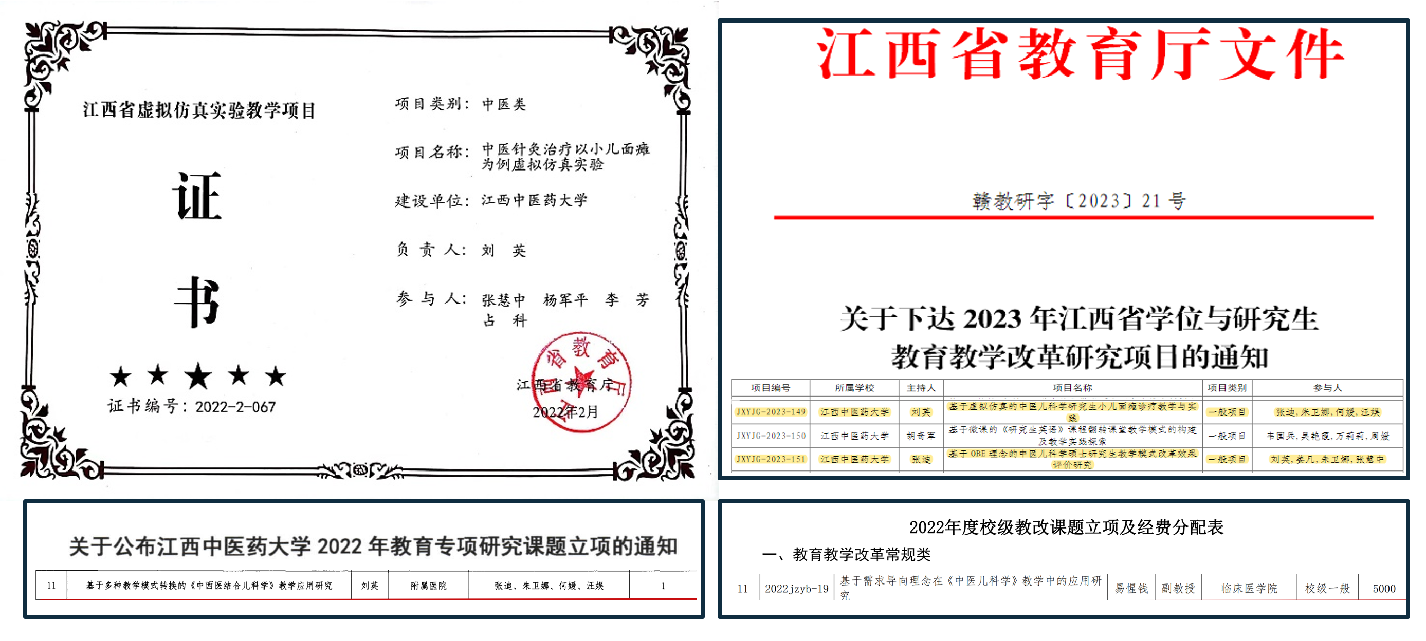 儿科教学团队负责全校《中儿科学》《中西医结合儿科学》等本科课程,以及《中医儿科学研究》《小儿温病学》《中医儿科学案例选读》等博士、硕士研究生课程教学任务,并于2022年获批为江西省高水平本科教学团队。除此之外,还获批立项校级一流本科课程1项,校级“课程思政”示范课程1项,校虚拟仿真实验教学项目2项。团队朱卫娜副主任医师在校第一届课程思政教学大赛上荣获铜奖1项。