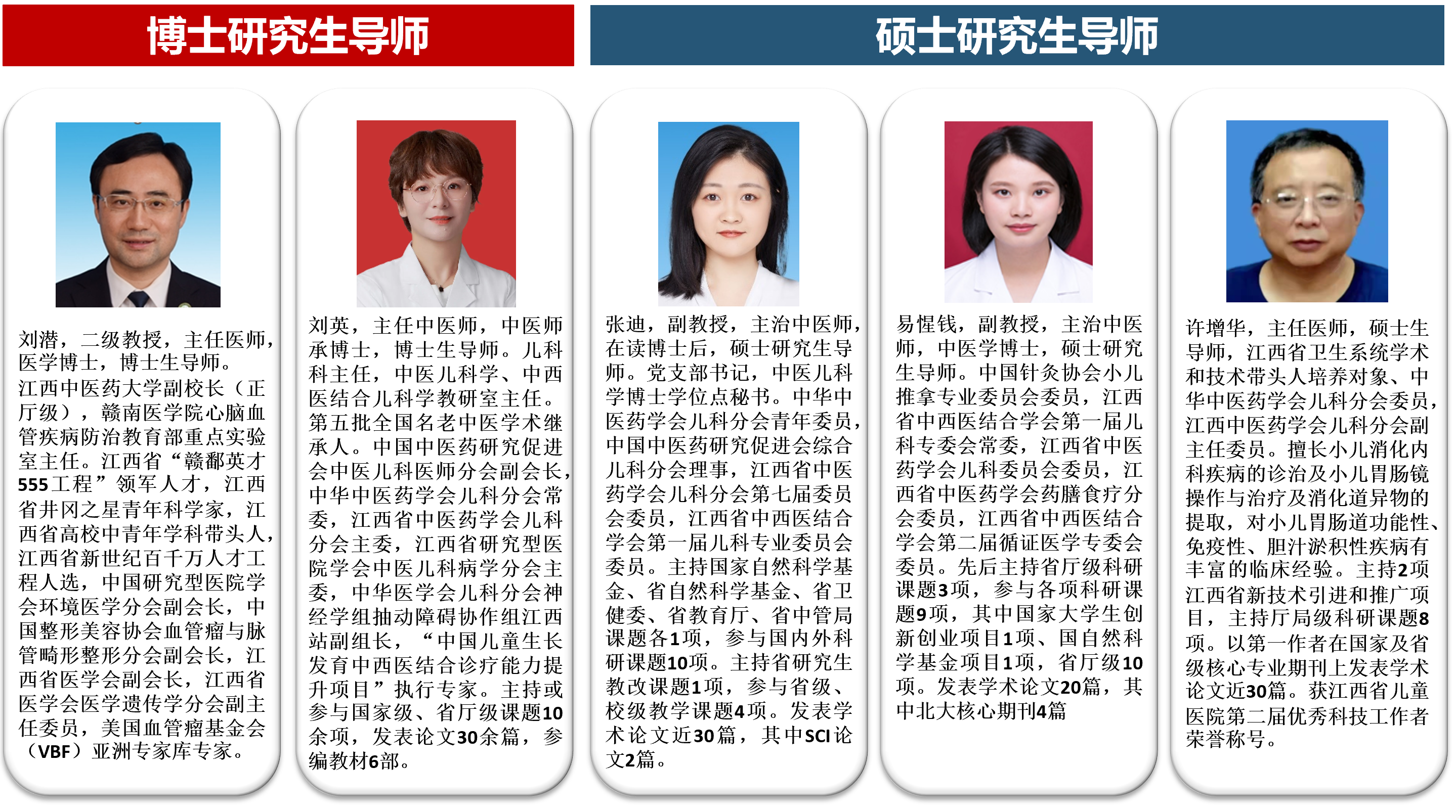 儿科教研室成立于1963年9月,现任教研室主任为刘英主任。儿科为校级重点培育学科,目前,拥有中医儿科学硕士学位点(专业型、学术型),中医儿科学博士学位点(专业型)。儿科教研室在岗教职工中具有副高及以上专业技术职称8人,博士研究生导师2人(刘潜教授、刘英主任),硕士研究生导师2人(张迪副教授、易惺钱副教授),校外硕士研究生导师1人(许增华主任)。