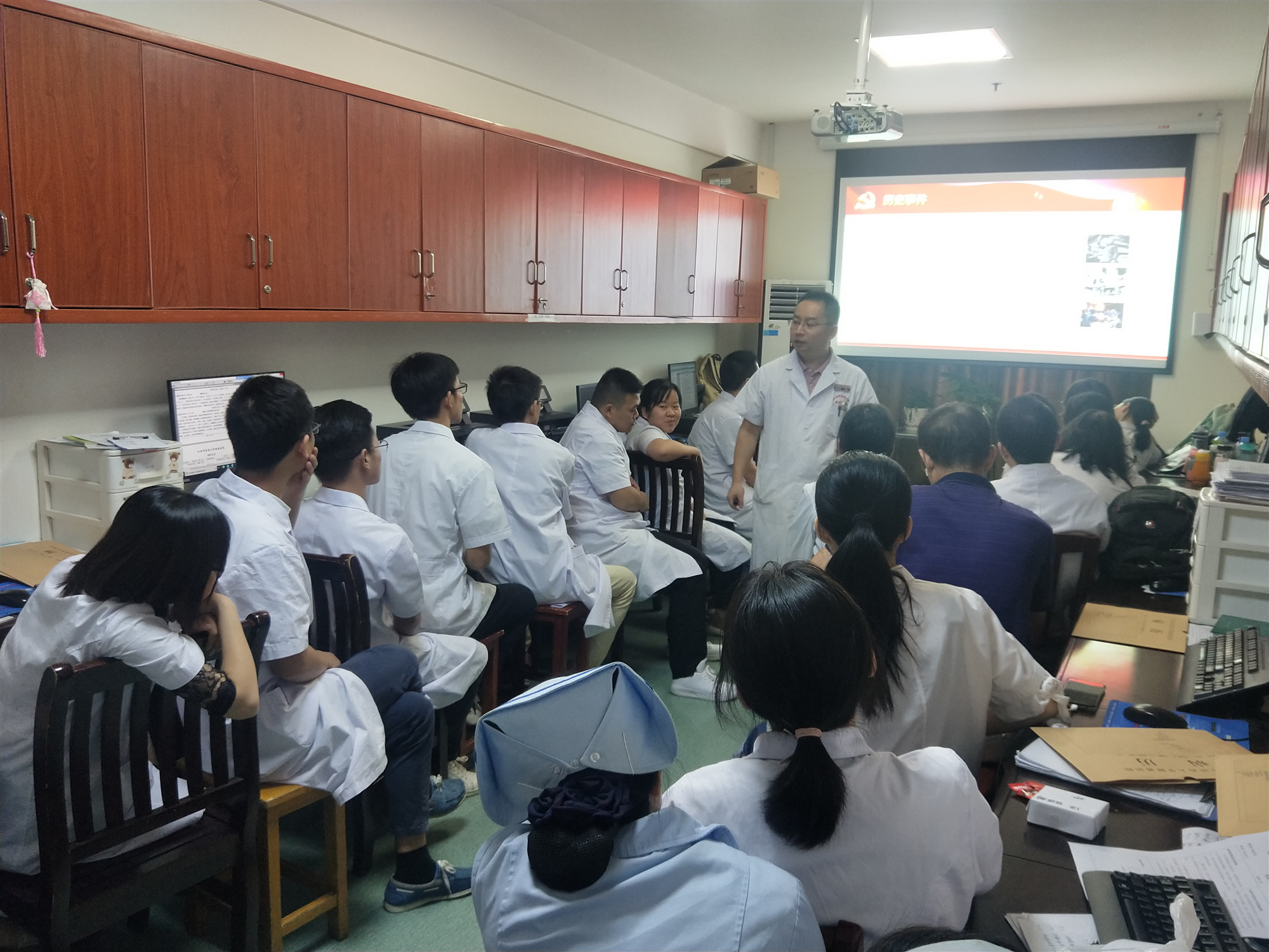 血液科在教授知识的同时,还非常重视学生医德医风的建设及思想品德的教育,通过“大医精诚”、“特鲁多医生墓志铭”等医学人文知识和精神的讲授以及临床上对患友点滴关爱的亲身示范,把“德育”始终贯穿于“授业”的全过程。9.25日中午,内科党总支第六党支部进行了“支部书记上党课”主题学习活动,在血液科学习的同学们列席会议参加了听课。血液科主任曾英坚作为支部书记带领大家共同学习了井冈山精神在新时期的时代意义,同时结合实际指出,作为即将走上医疗岗位的每位医学生应该清晰认识到自己即将从事的医疗工作不单单是一份职业,更重要的还是一份“健康所托、生命所付”的光荣责任和使命,唯有继续努力学习、不断提高自身的医学知识和思想医德修养,才可能不忘初心、不辱使命,真正做到大医精诚、为建设健康中国作出自己应有的贡献!
