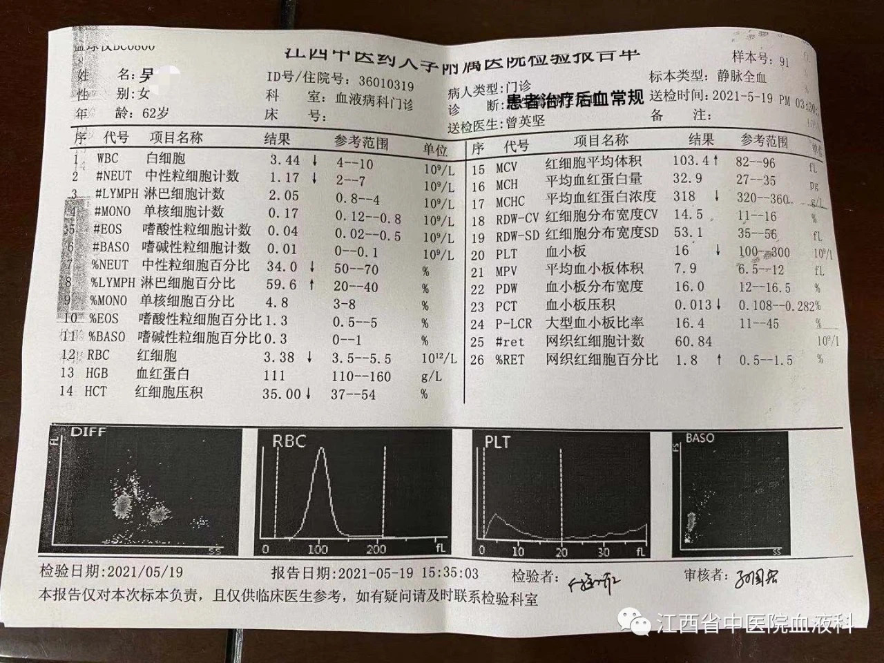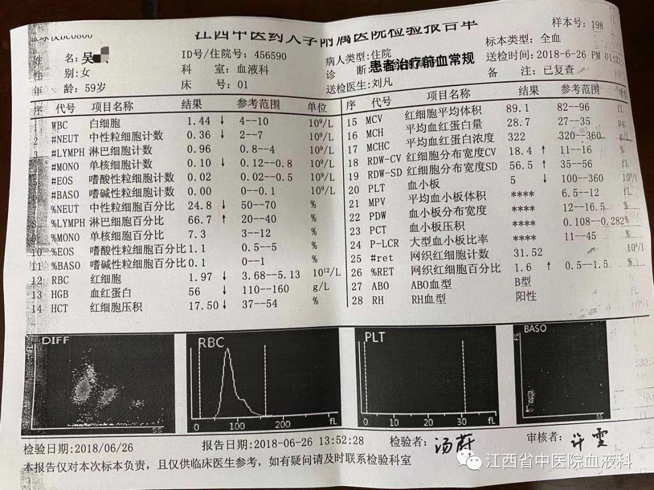 吴女士就是一位MDS患者,她于2018-6-26因“反复乏力3月余”入院,查体示贫血貌,全身散在瘀点瘀斑。入院查血常规:白细胞 1.44*109/L、中性粒细胞计数0.36*109/L、中性粒细胞百分比 24.8%、红细胞 1.97*1012/L、血红蛋白 56g/L、网织红细胞计数 31.52*109/L、血小板 5*109/L,提示全血细胞减少。骨髓穿刺行骨髓细胞学:血像:外周血成熟淋巴细胞比例升高,成熟红细胞同髓片,血小板散在少见;骨髓象:骨髓增生明显活跃,粒细胞比倒置,粒系增生稍减低,伴轻度病态改变,红系增生明显活跃,伴病态改变,全片共见巨核细胞2个,伴成熟障碍,请结合临床及骨髓活检。流式细胞免疫荧光分析:流式细胞结果提示送检标本中未检测到明显急性白血病和高危MDS相关免疫表型异常证据。高敏PNH:正常(未检测到PNH克隆)。骨髓活检:骨髓增生减低,不排除再生障碍性贫血,请结合临床、骨髓涂片及其他检查诊断∕建议必要时异位取材、追踪复查。分子病理:MDS/MPN中基因突变检测Panel(30基因)均未检测到突变。诊断:1.全血细胞减少 骨髓增生异常综合征(低增生)? 2.高血压病 3.乙型肝炎小三阳 4.2型糖尿病。患者全血细胞减少,经多家三甲金瓶梅电影 综合评估,血液病情考虑为“骨髓增生异常综合征”,予输注红细胞、血小板等成分输血,予降糖降压、止血、抗乙肝病毒、环孢素抑制免疫、重组人促红细胞生成素促进造血等治疗。