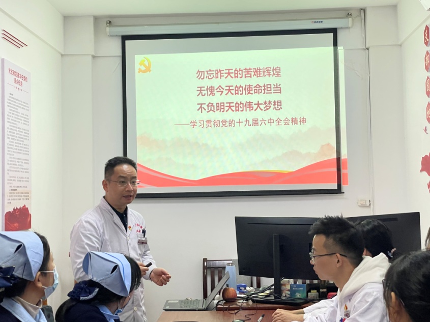 支部委员张欢表示:总结过去是为了更好地面向未来,不忘初心是事业成败的关键,十九届六中全会全面总结了党的百年奋斗重大成就和历史经验,作为新时代的医护人员应敢闯敢拼、肩负使命,为患者提供更有质量、更有温度的医疗护理服务。