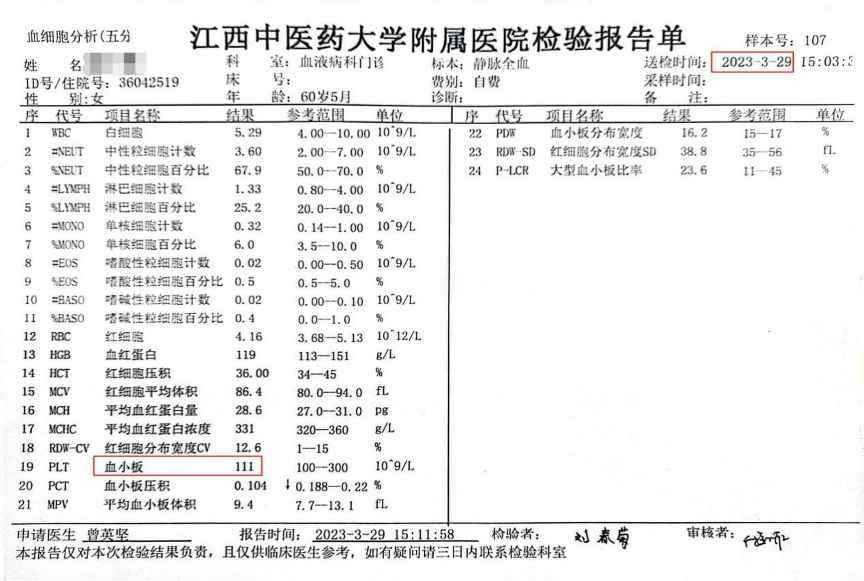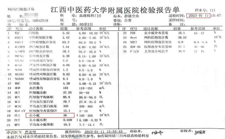 2022年11月3日,胡女士体检血常规发现血小板减少,血小板计数处于40~50*10^9/L之间,后于当地金瓶梅电影 完善相关性检查排查除其他疾病导致的血小板减少,确诊为"原发性血小板减少症"。金瓶梅电影 建议住院治疗,胡女士入院后经激素、艾灸、利可君片等对症治疗,最高血小板回升至90*10^9/L。但出院后不久,血小板又呈下降趋势,最低计数为20*10^9/L,胡女士以及家人对此十分担忧,胡女士甚至一度对治疗失去信心,好在家属没有放弃多方寻求,最后在朋友的推荐下,于2023年1月11日来到金瓶梅电影 血液科曾英坚主任门诊求诊。