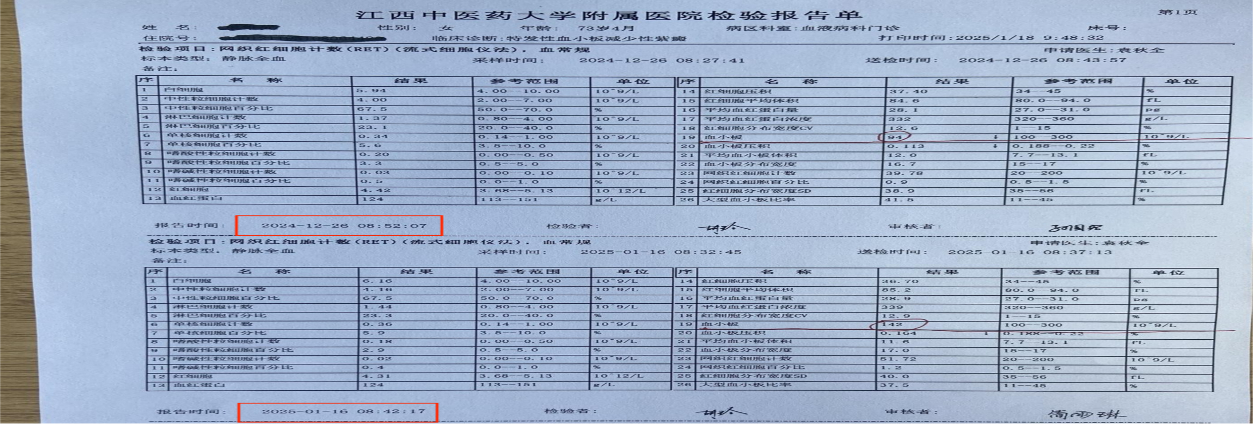 在辨明李大妈发病病机后,袁医生采用中西医融合技术为李大妈制定了个体化中西结合治疗方案,西医方面:调整为阿伐曲泊帕1片口服,每日1次升血小板,并联合治疗干燥综合征,抗幽门螺旋杆菌。中医方面:经四诊合参,辨病为“紫癜病”,辩证为燥热伤津证;是因燥热伤津,津枯血燥,燥邪郁久发热,热邪入血,破血妄行而发病,中医中药在柴胡木贼汤清热凉血止血加上玉竹、白芍、麦冬以滋阴润燥,血小板恢复后出院。出院后随访至今已1月,血小板计数正常,李大妈口干、咽干、自觉发热表现也已经消失;就在前不久1月16日复查血小板142*10^9/L,可喜可贺。
