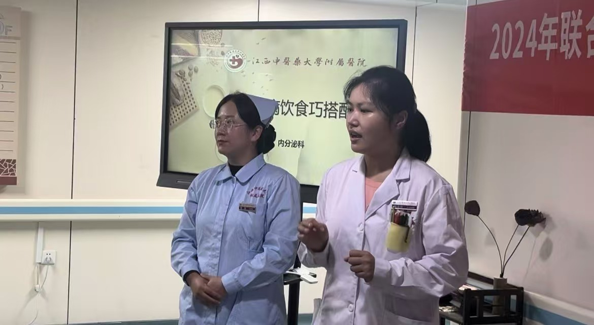 在患者教育活动环节,内分泌科医护向患者展示了中药代茶饮,以降糖茶和六仙饮等为例。由医生为大家讲解代茶饮中药食同源的中药,并指出其药用价值。如葛根,玉竹,麦冬等滋阴生津止渴,人参大补元气,黄芪补气升阳,枸杞子,黄精滋补肝肾等,并强调了了制作中药代茶饮需要严格遵循中草药的配比和煎煮方法,以确保其药用价值得到充分发挥。患者们在饮用时也需要根据个人体质和病情进行适量调整,避免过量或不当饮用带来的负面影响,故而代茶饮的使用需要在医生的指导下使用。接下来,对于患者饮食运动等生活管理进行了阐述,让患者们对糖尿病的知识有了更加全面的认识,对糖尿病的健康管控也有所了解。患者们积极互动,品尝了中药代茶饮,现场气氛热烈而温馨。