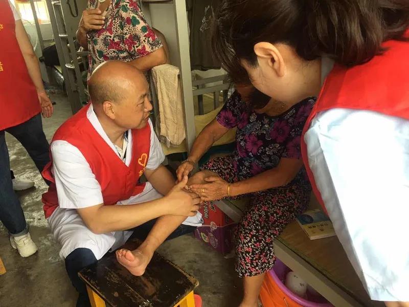志愿者服务队兵分两路,一队在酷暑下,为前来就诊的受灾群众提供现场咨询、检查、治疗等健康服务,义诊台前络绎不绝,挤满了前来咨询的受灾群众以及防汛干部。义诊现场由由刘峰主任、饶泉主任、黄丽君护士长、周群护士长负责带队,志愿者李旭、万芳丹尽自己所能为群众进行穴位贴敷,铜砭刮痧,穴位按摩,测血压,测血糖,发放宣传单等,并认真解答村民们关于灾后常见病、多发病的预防及治疗等相关问题,并对灾后疾病防治知识进行宣传,脑外科熊志阳主任针对疫情防治,各类头疼等做了详细的解答。医疗志愿者服务队尽全力为广大安置点群众服务,受灾点群众对我们的到来表示我们由衷的感谢,让他们感受到了‘‘急难有情,情有馀兮’’的温暖。