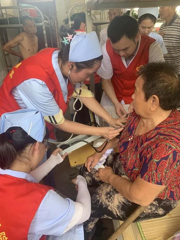 同时,为了更好地为老弱病残灾民服务,另一组医疗队,由李清萍副书记、陈岗主任、邓科穗主任带队,志愿者欧阳萍、贾超等医护专家组成,深入每一间由教室改造成的受灾群众临时安置点内,到床边为行动不便的老人、孕妇、儿童等检查身体。走进一间间教室,与受灾老人攀谈,询问家中受灾情况,身体健康状况等,并为老人、产妇、儿童等把脉、问诊、测量血压、检查身体、测血糖等,送医送药到床边。现场受灾群众被深深感动,老人流下了感动的泪水,并表示在党和政府的关心和帮助下,在党的正确领导,一定能早日结束灾情,重建美好家园。