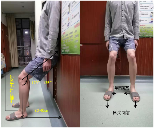 背靠墙,双足分开,与肩同宽,逐渐向前移离墙30一40cm,此时身体出现下蹲的姿态。使小腿与地面垂直。大腿和小腿之间夹角大约在120-135之间,这样髌骨关节的压力不太大,也不会造成肌肉过度疲劳。如图所示:
